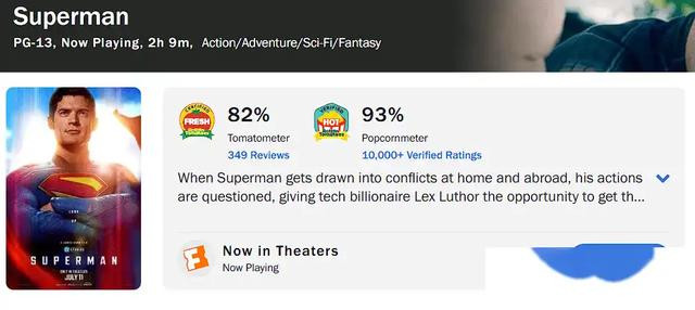 根据烂番茄网站的数据来看,新《超人》新鲜度为82%。